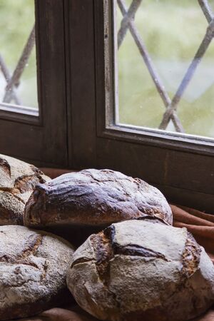 Sliced bread on wooden table. Baked bread of sourdough. Bread crust. The bread of sourdough, homemade and natural creation. The sourdough has natural yeast, which makes the food healthier, as well as