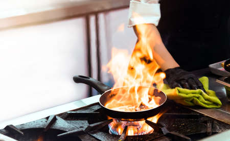 Chef cooking food in pan with fire flame on black background. Restaurant and hotel service concept. Free advertising space