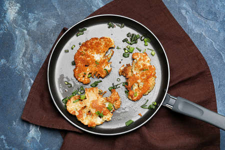 Appetizing potato pancakes are fried in a pan. Foodcord. Top view