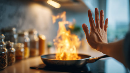 Hand extends towards a flaming pan on a kitchen stove, with jars of spices and herbs arranged on the countertop in a contemporary kitchen