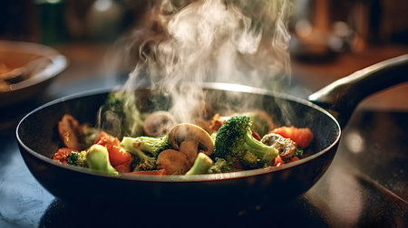 Fresh chopped broccoli, mushrooms and mixed vegetables sizzling in a black frying pan on the stovetop, steam rising and creating a vibrant, healthy stir fry meal