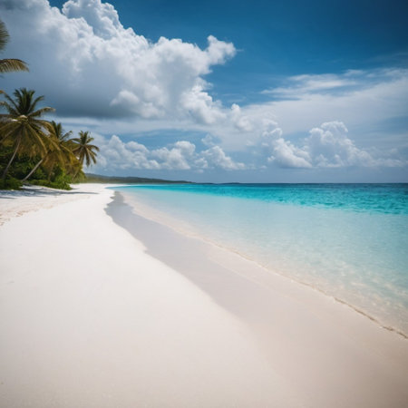 A breathtaking view of a tropical beach with pristine white sand, turquoise waters, and swaying palm trees. The image evokes a sense of tranquility and paradise, inviting viewers to escape to a serene tropical destination.