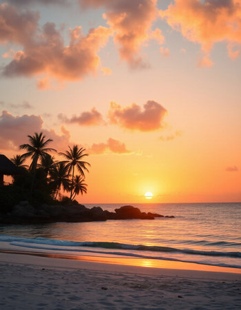 A vibrant tropical beach scene at sunset with palm trees leaning over the sandy shore. The sky is filled with warm hues of yellow, orange, and pink, casting a serene glow over the ocean. The horizon is dotted with scattered clouds, and the calm waters gently meet the shoreline. The beach is peaceful with a few distant figures, creating a tranquil and relaxing atmosphere.