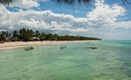 beautiful landscape with african beach and touristic boats on water, Zanzibar