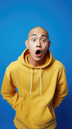 Young chinese man wearing casual yellow hoodie standing over isolated blue background afraid and amazed with surprise expression amazed expression face.