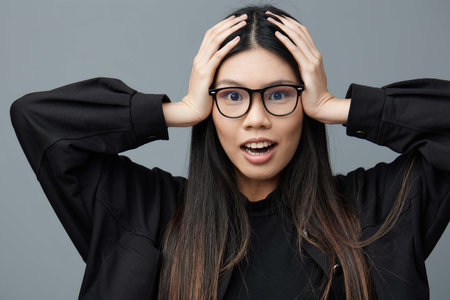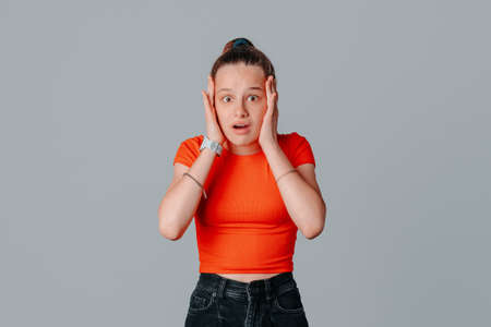 Shocked and worried teen girl hold hands on head, open mouth and look scared, forget remember smth bad, concerned, isolated on gray background