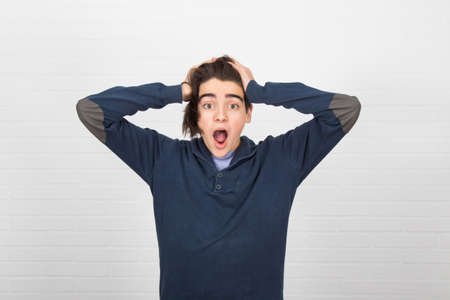 A young teenager exhibits a strong expression of overwhelm and anxiety. Hands are placed on his head in a gesture of frustration, capturing a moment of intense stress and emotion. The image conveys the struggles and challenges faced during adolescence.