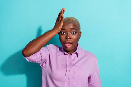 Photo of impressed confused person arm touch forehead open mouth isolated on turquoise color background