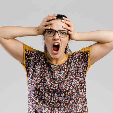 Closeup portrait of a shocked young woman looking at camera and screaming.