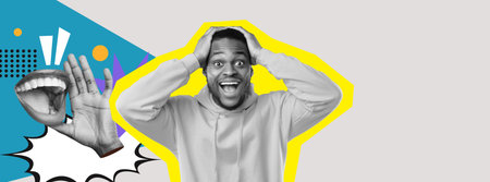 Wow, its unbelievable. Surprised albino guy seeing shocking advertisement, emotionally reacting, panorama, free space