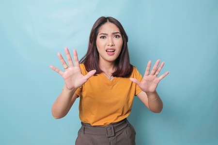 Stop. Concerned Asian woman showing refusal sign, saying no, raise awareness, standing over blue background