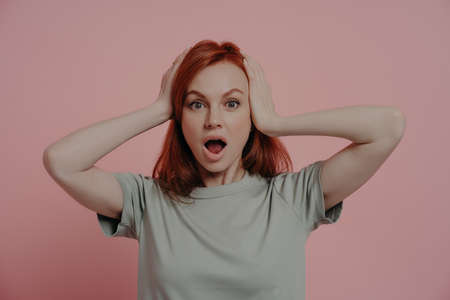 Indoor shot of shocked scared woman keeping head in hands, staring at camera with bugged eyes from surprise or wonderment and dropped jaw, being in shock while posing isolated over pink background