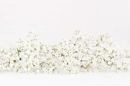 closeup of small white gypsophila flowers on white or background
