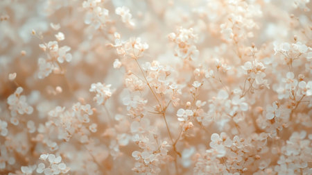 A blurry, intimate view of numerous tiny white flowers clustered together, creating a delicate and airy texture. Soft lighting enhances their ethereal quality.