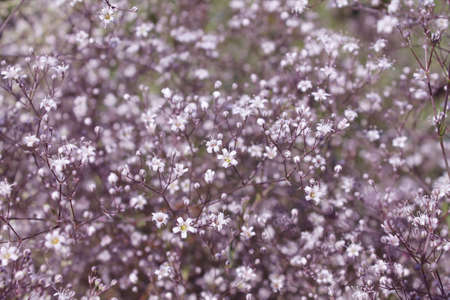 Blurry soft gentle background with many white Baby's Breath (Gypsophila paniculata) flowers in the garden. Nature background with common gypsophila flowers. Soft dreamy image.