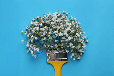 Creative composition with paint brush and gypsophila flowers on light blue background, top view