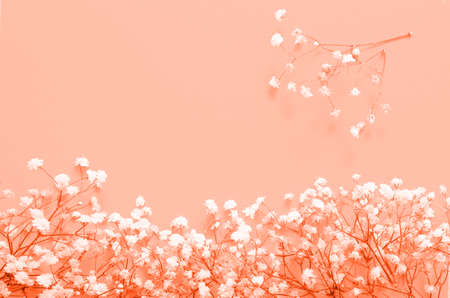Soft blured of gypsophila flowers in living coral color. Pantone color of the year 2019 concept.