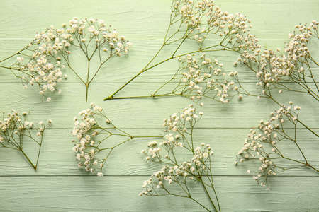 Beautiful gypsophila flowers on color wooden background