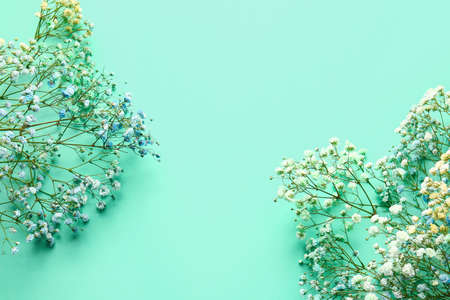 White gypsophila flowers on turquoise background. Flat lay, top view.