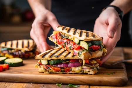 hand layering grilled vegetables on brick-pressed panini, created with generative ai