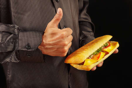 Man in black shirt recommends and likes big cheeseburger on a black background