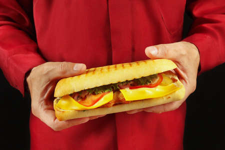 Hands of man in a red shirt are holding a cheeseburger on a black background