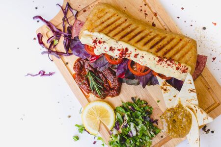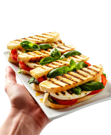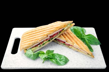 Healthy Grilled Basil mozzarella Caprese Panini Sandwich white Board isolated. Classic Italian fast food.