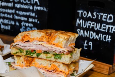 Fresh sandwiches on wooden cutting board in window shopping of cafe or restaurant. Food. Catering.