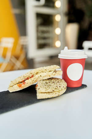 A sandwich with a red plastic glass of coffee on the table in a coffee shop.