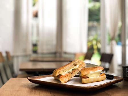 Turkish Sandwich Toast (Tost) with cheddar or melted cheese on wooden background ,top view