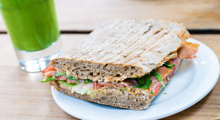 Sandwich with ham, tomato, rucola und salad serviert with smoothie on wooden table.