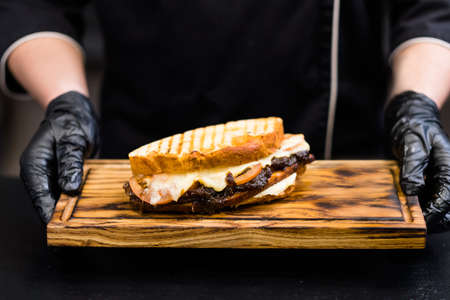 Grill restaurant. Chef holding smoked turkey breast sandwich on wooden board.