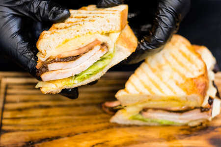 Grill restaurant. Closeup of chef hands holding a half of smoked turkey breast sandwich over wooden board.