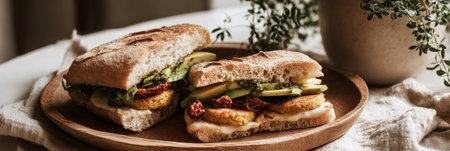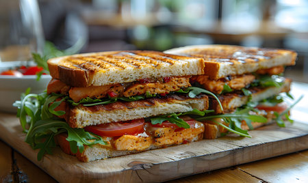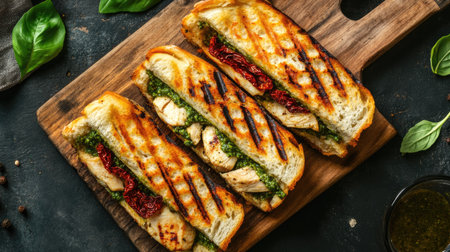 Top view of a delicious panini with grilled chicken, pesto, and sun-dried tomatoes, cut into halves and arranged on a wooden board.