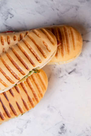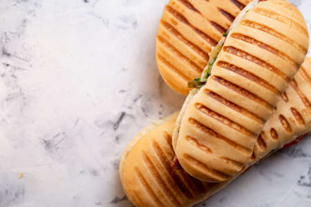 panini caprese with tomato, mozzarella and basil, Caprese Panini Sandwich. Delicious breakfast or snack, Clean eating, dieting, vegan food concept. top view.