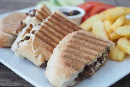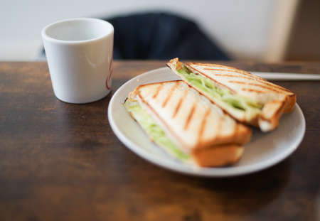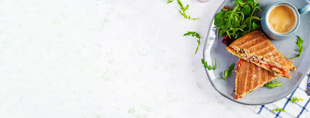 Grilled club sandwich panini with beef, tomato, cheese, lettuce and cup of coffee. Delicious breakfast or snack. Top view, overhead, banner
