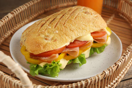 Delicious sandwich with vegetables, ham and mayonnaise served on wicker tray, closeup