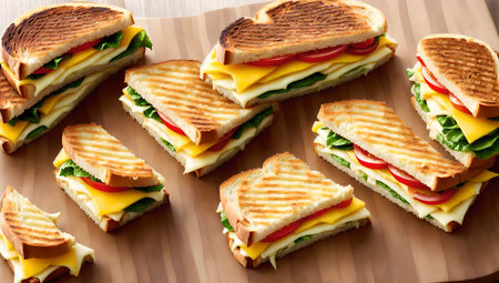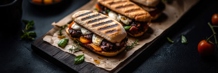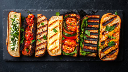 A vibrant display of delicious grilled sandwiches arranged on a slate serving board, topped with fresh herbs. Perfect for summer picnics and casual dining occasions.
