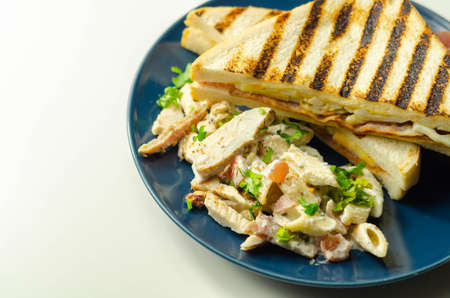 White bread with beechwood smoked bacon, egg, mayonnaise, and tomato served with Caesar pasta with parmesan cheeseon the blue plate, morning meal