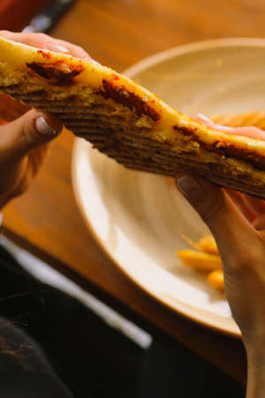 Woman eating triangle slice sandwich ham and cheese in breakfast