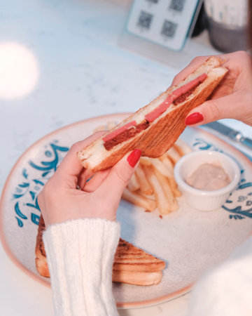 Girl with red manicure holding a sandwich with cheese and bacon.