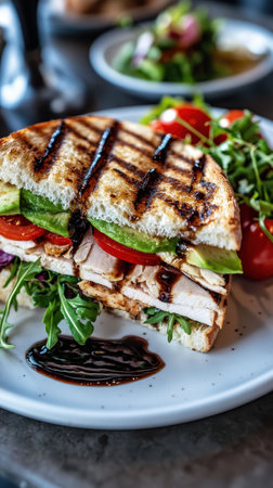 A delectable grilled chicken avocado panini showcases succulent chicken strips, ripe avocado, and fresh tomatoes, sandwiched between perfectly toasted bread. garnished with herbs, this appetizing meal is served with a side of creamy guacamole. Generative AI
