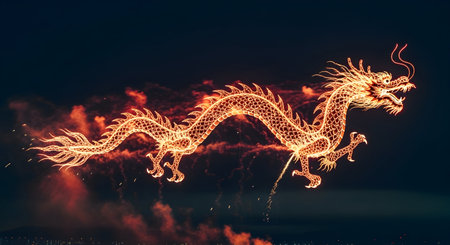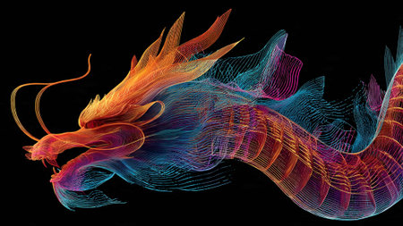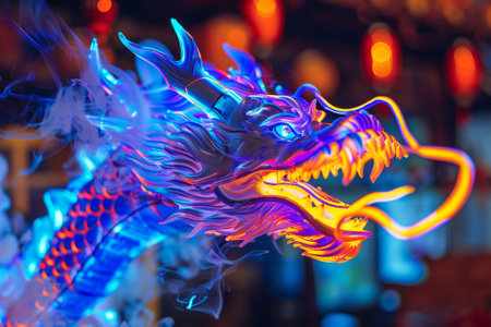 glowing dragon, fantasy creature, digital art, mystical, vibrant colors, neon lights, abstract design, blue and orange tones, ethereal background, animated style