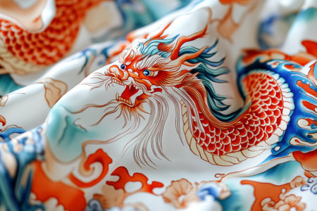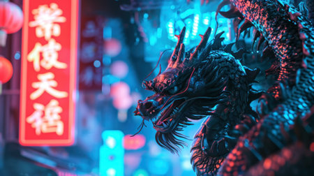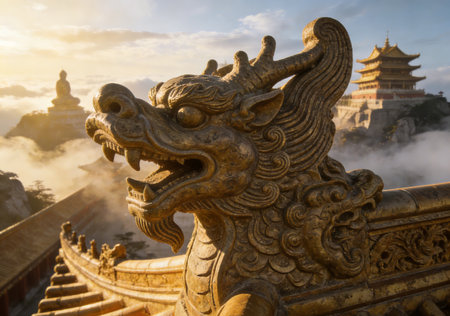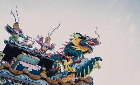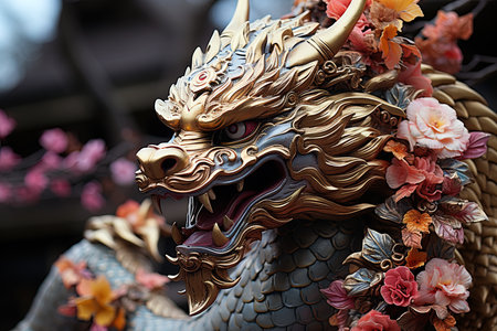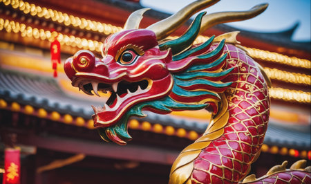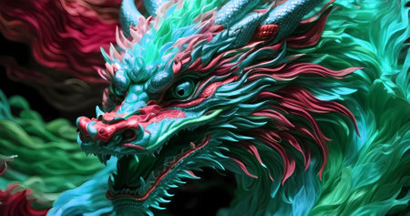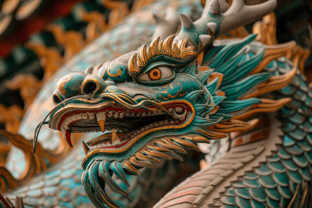 Closeup of an intricate chinese dragon statue with vibrant colors and textures, symbolizing power and culture
