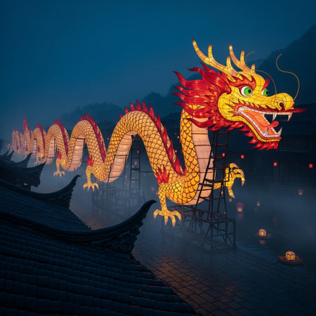 Vibrant Multicolored Lanterns and a 3D Dragon Structure against the Night Sky