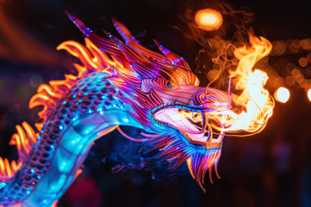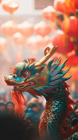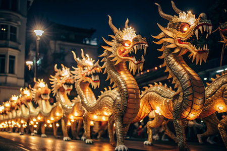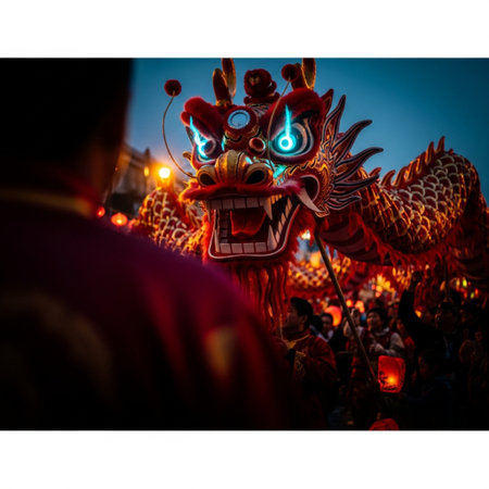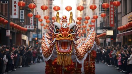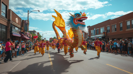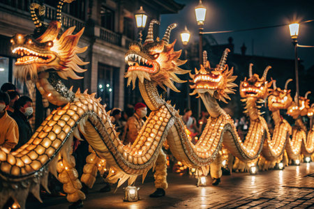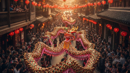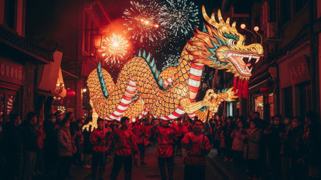 A Dragon parade celebration in chinese street with traditional costume lantern culture and crowd festival