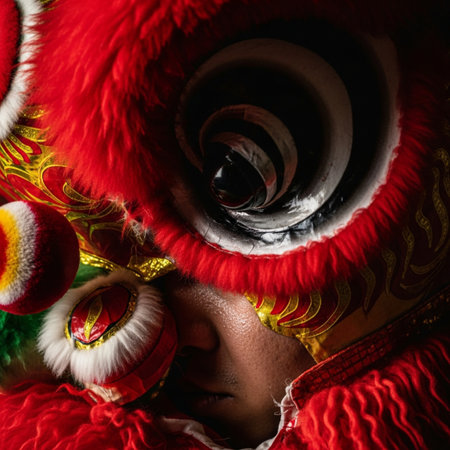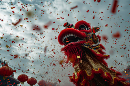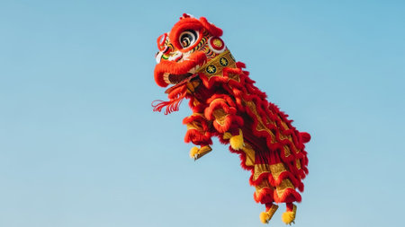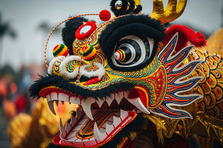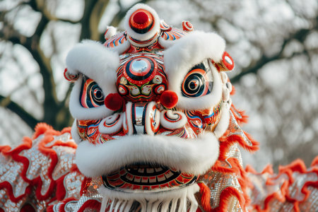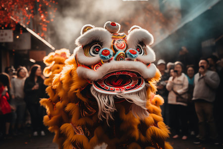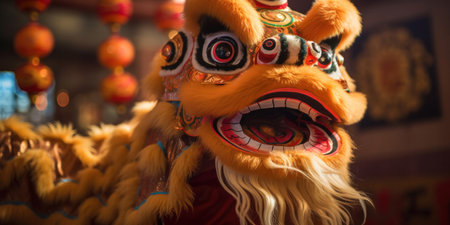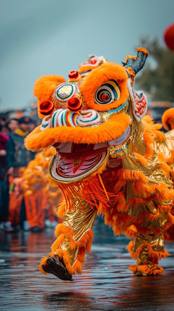 Traditional Chinese lion dance, colorful costume, festive atmosphere