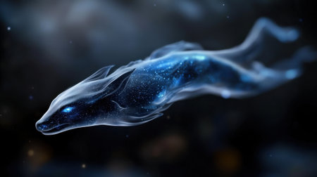 A translucent, mythical creature glides through a starry galaxy, its body shimmering with cosmic colors. The night setting enhances the magical atmosphere of the scene.