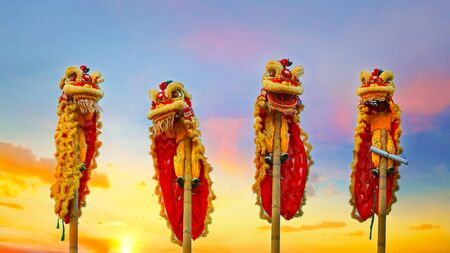 Chinese new year celebration, dragon and lion dance in traditional costume during Chinese New Year parade