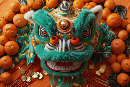 A dragon mask is surrounded by oranges and coins. The dragon is green and has a mouth that is open. The oranges and coins are scattered around the dragon, creating a festive and celebratory atmosphere
